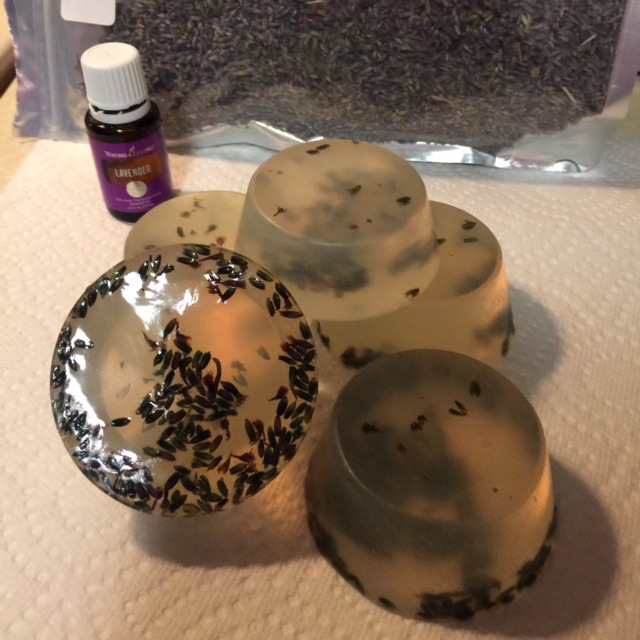 I used the soap cutter to cut the block of organic olive oil melt-and-pour suspension soap into cubes (husband helped, as he was curious), melted it in a double boiler I bought from Bed Bath & Beyond (with 20 percent off coupon, yes!) and added the dried lavender flowers. Next, I poured the mixture into a glass measuring cup , stirred in lavender essential oil and poured the soap into the mold that I had sprayed with rubbing alcohol to eliminate bubbles. After I filled the soap mold, I sprayed the alcohol on the surface of the soap, as well. Once the soap cooled, I popped it out of the mold. So easy, and the soap, which I’ve named La-La-Lavender, is divine.